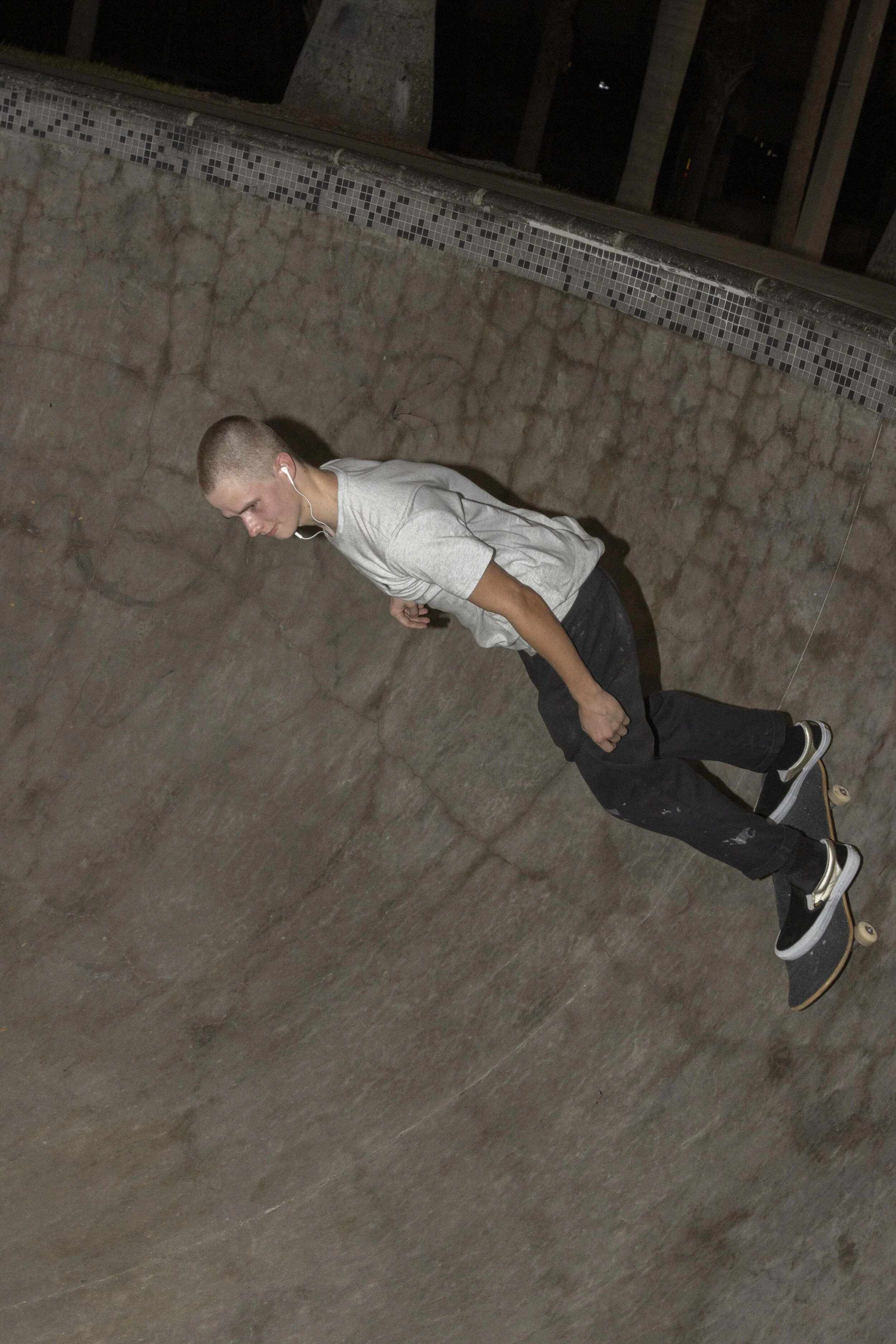 Alex has been skating for ten years and decided to start after receiving his first flip phone. He only skates in his free time now after choosing to pursue a career rather than skate full time. Alex always listens to music with his headphones while skating.
